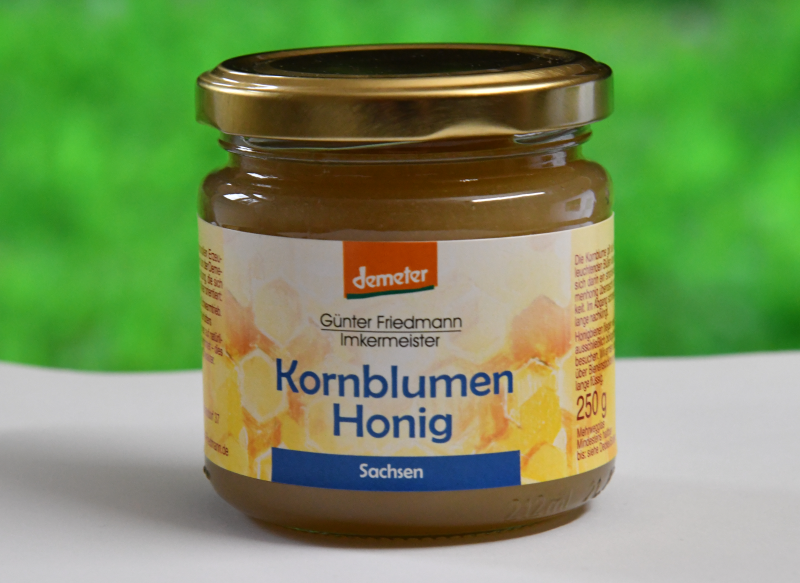 Wir ernten unseren Kornblumenhonig in voller Reife. Er wird nie über Bienenstocktemperatur (35°C) erwärmt. Durch einen höheren Anteil Frühlingsblütenhonig (Vorrat im Bienenstock) bleibt dieser Honig möglicherweise nicht sehr lange flüssig.